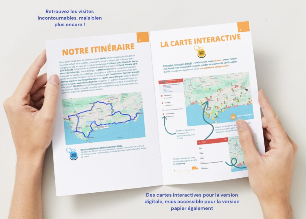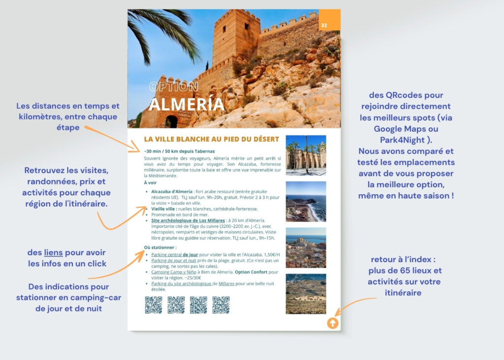 Tous les lieux de nos voyages sur un itinéraire clef-en-main au départ de Seville, avec des détours en option, la géolocalisation des parkings, aires de camping-cars et campings, des options confort ou économiques, ainsi que tous les horaires, prix et infos pratiques pour les visites. Et retrouvez aussi des activités outdoor insolites partout en Andalousie ! Et en Bonus, notre carte interactive sur google Map avec tous les points déjà localisés.
