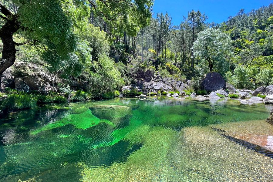 Montagnes granitiques, forêts anciennes et cascades sur eaux claires : c’est le seul parc national du Portugal et l’un des plus préservés. On alterne entre les belvédères faciles (Pedra Bela), les villages de pierre (Soajo, Lindoso) et de petites balades le long des rivières transparentes. Ne manquez pas Sistelo, souvent appelé le « petit Tibet portugais », pour ses terrasses verdoyantes et ses sentiers ruraux. Les routes sont parfois étroites : mieux vaut circuler le matin et rayonner depuis une aire/camping en périphérie. En toute saison, l’ambiance reste sauvage et authentique.
